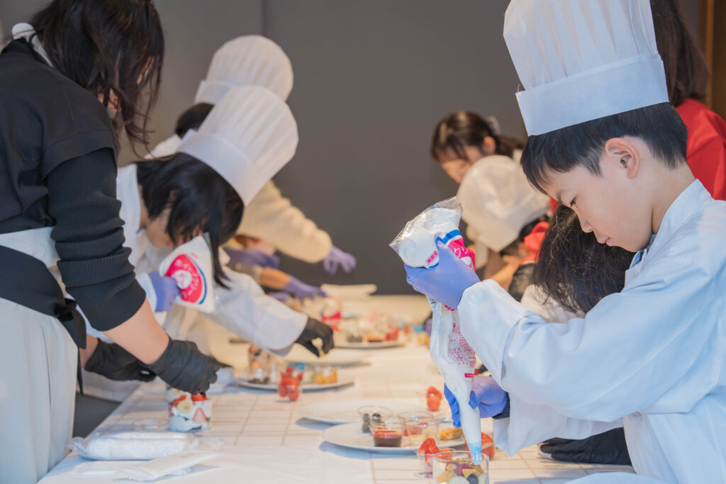 当日は、40名を超える小学生親子にご参加いただき、お子さまはコック帽子とコックコートを身に着けて、パティシエ気分でミニパフェつくりを体験しました。