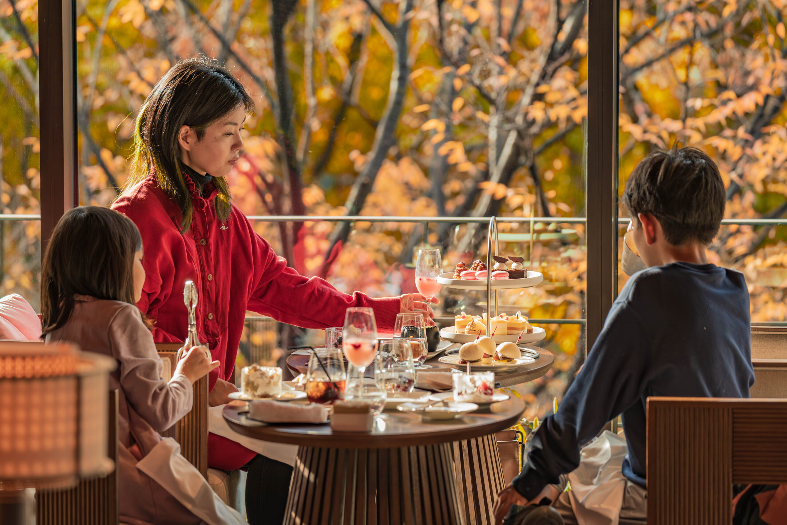 パフェつくりの後は、久屋大通公園の紅葉を臨むホテル内のラウンジで、お子さまが仕上げた世界にひとつだけのデザートを含むアフタヌーンティーを、親子でお楽しみいただきました。