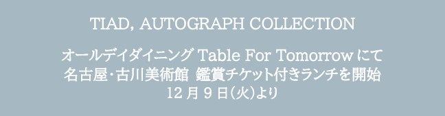 「TIAD, オートグラフ コレクション」(所在地:名古屋市中区栄5-15-19、総支配人:中田匡彦、以下 TIAD)は、2025年12月9日(火)より、館内5階のオールデイダイニング「Table For Tomorrow」にて、古川美術館鑑賞チケット付きランチプランの販売を開始いたします。